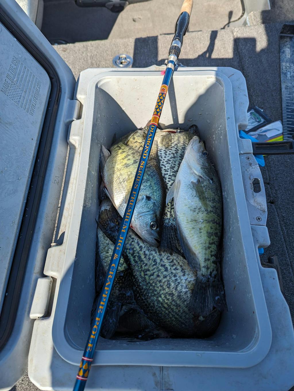The Diamond Series Jig Pole is available in 8-, 10-, 12-, and 13-1/2-foot lengths (all 2-piece construction). This jig pole is made from high modulus graphite that provides a stiffer backbone and maintains tip sensitivity. This perfectly balanced pole uses high quality aluminum oxide frames with stainless steel inserts. This is one of the best-looking rods on the market due to its gleaming royal blue color and silver accents along with its 100% carbon fiber handle. 12 ft 6.2 oz, 13.5 ft 7.2 oz